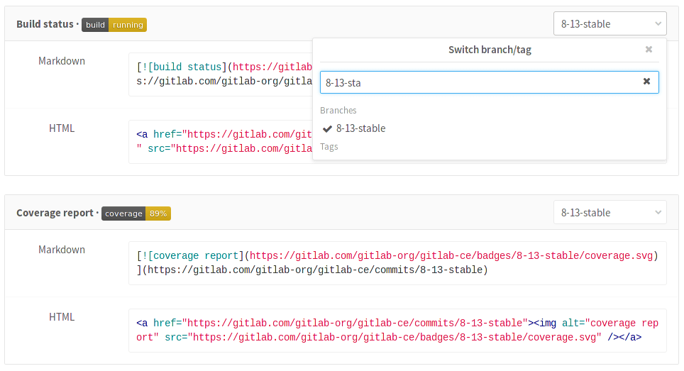 If you would like to get the coverage report from a specific job, you can add the job=coverage_job_name parameter to the URL. For example, the following Markdown code will embed the test coverage report badge of the coverage job into your README.md: