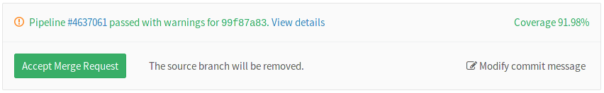 If the pipeline succeeds, the coverage is shown in the merge request widget and in the builds table.
